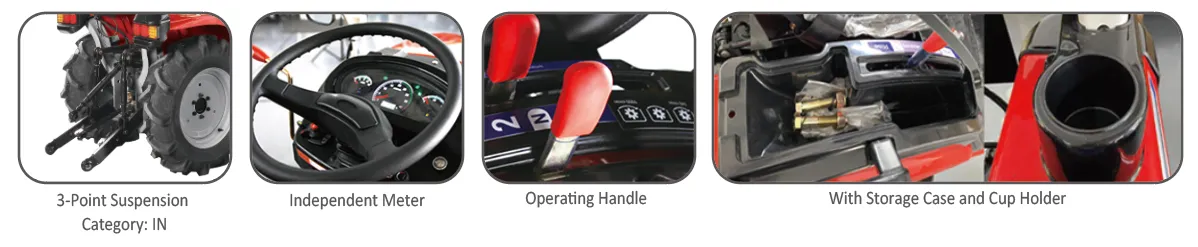 Working Device Hydraulic System Lifting Capacity at 450mm Behind Lift Point 350kg 3-Point Suspension Category: lN P.T.0. Shaft: Rotating Speed (rpm) 550/967 Spline Size 6-ф35 Rectangular Spline Front Wheel With Inner tube,steel Hub,dry land Wheel Specification 5-12 Wheel Track 750(standard)/960~1200(adjustable) Rear Wheel Without Inner Tube, Steel Hub, Dry land Whee Specification 8-16 Wheel Wrack 760(standard)/960~1200 (adjustable) |