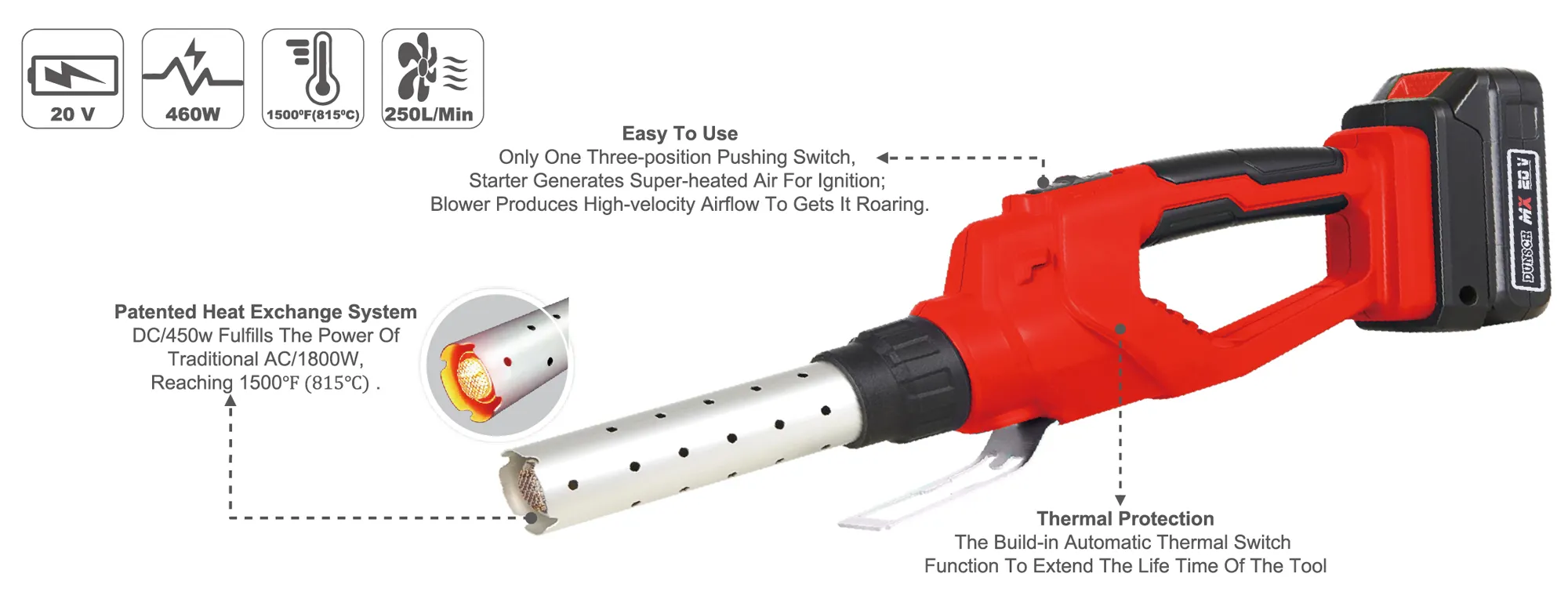 - ·The Tool Produces Super-heated Air With 1500° F(815°c)Temperature For ignition Without Any CombustionLiquids And Gases.